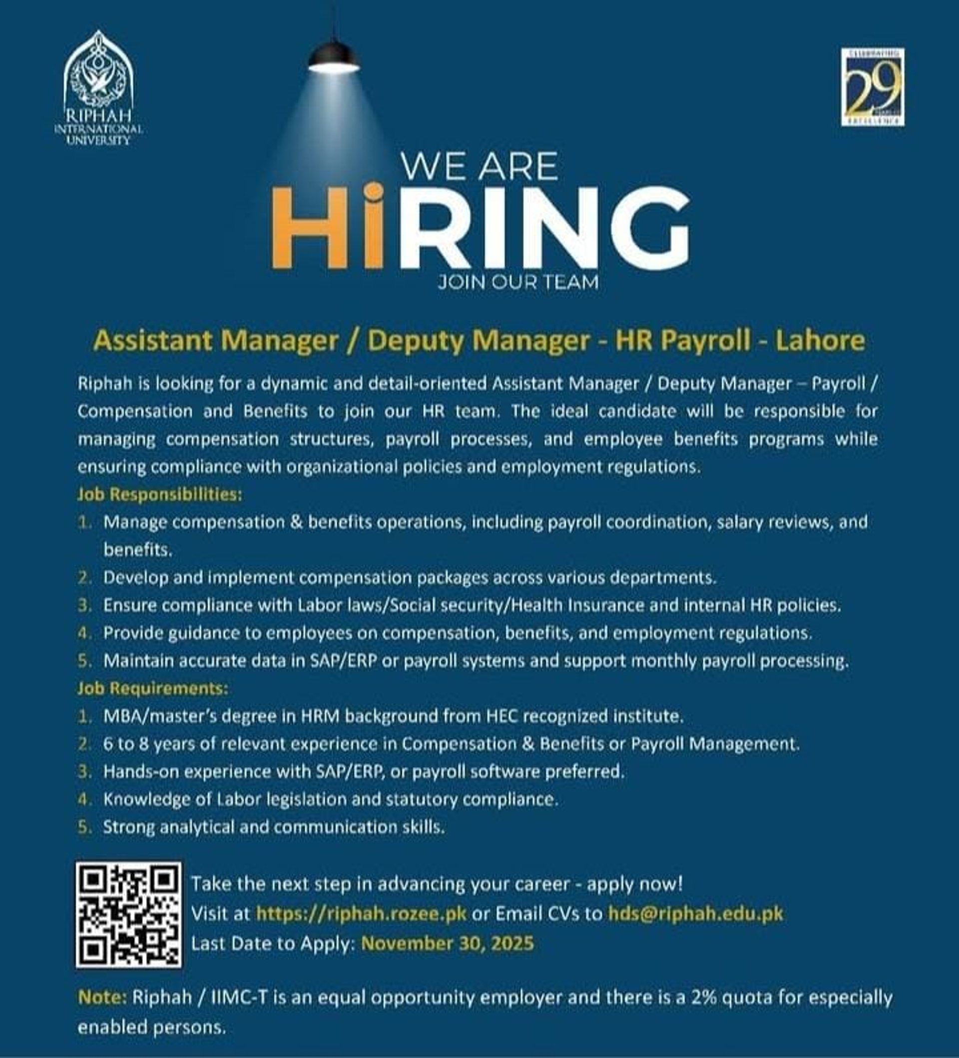 MBA / Master Degree in HRM background with 6 - 8 years of experience in compensation & Benefits or payroll management Apply Online: hds@riphah.edu.pk Last date to apply: 30 Nov 2025