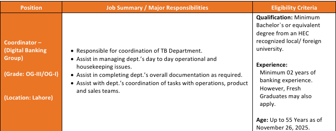 Coordinator for Digital Banking Group (OG-III/OG-I) Lahore Last date: 26 November 2025