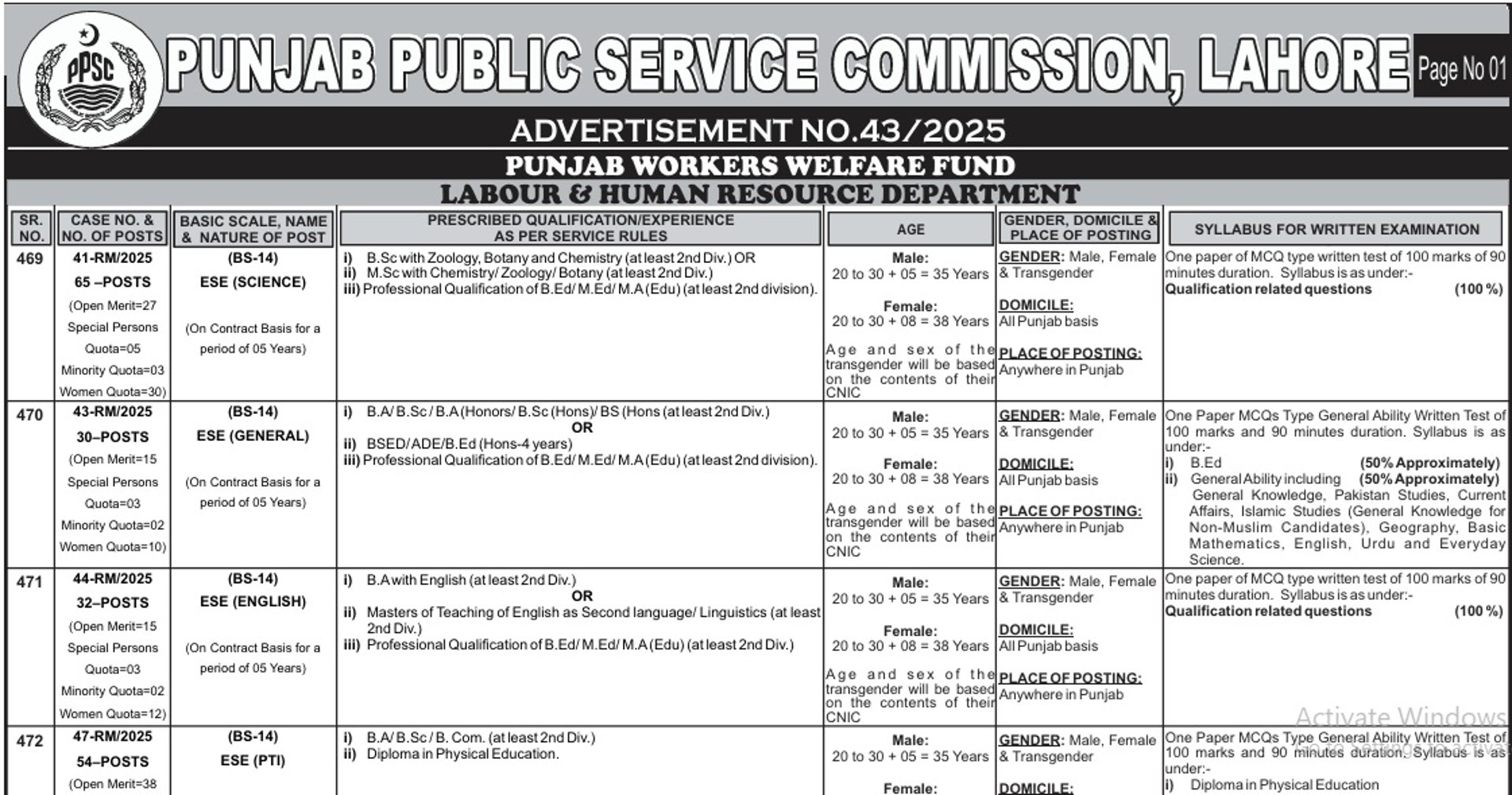 ESE Jobs for Various Subjects in BS-14 Govt Jobs and Lab Assistant BS-11